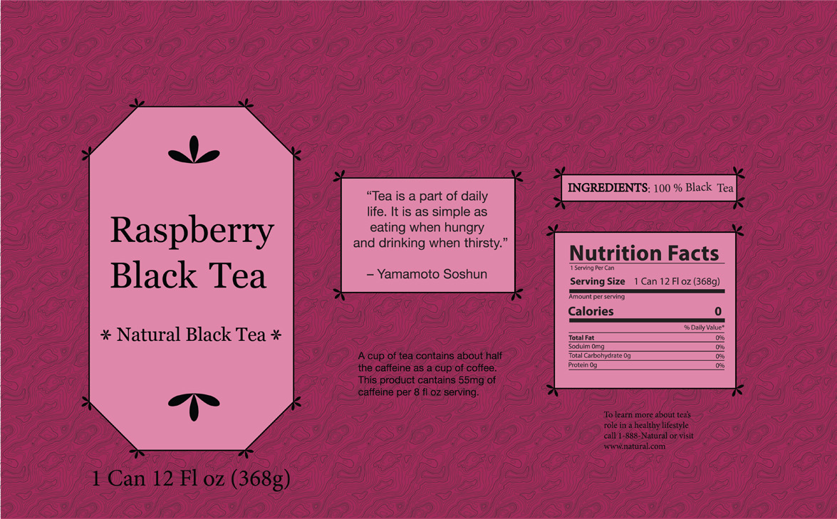 A subtle repeating organic pattern adds texture across all variants, adapting in color per flavor. The label also includes required product information such as ingredients, nutrition facts, and serving size. Each 12 oz can emphasizes clarity, readability, and a cohesive system that supports future flavor expansion.