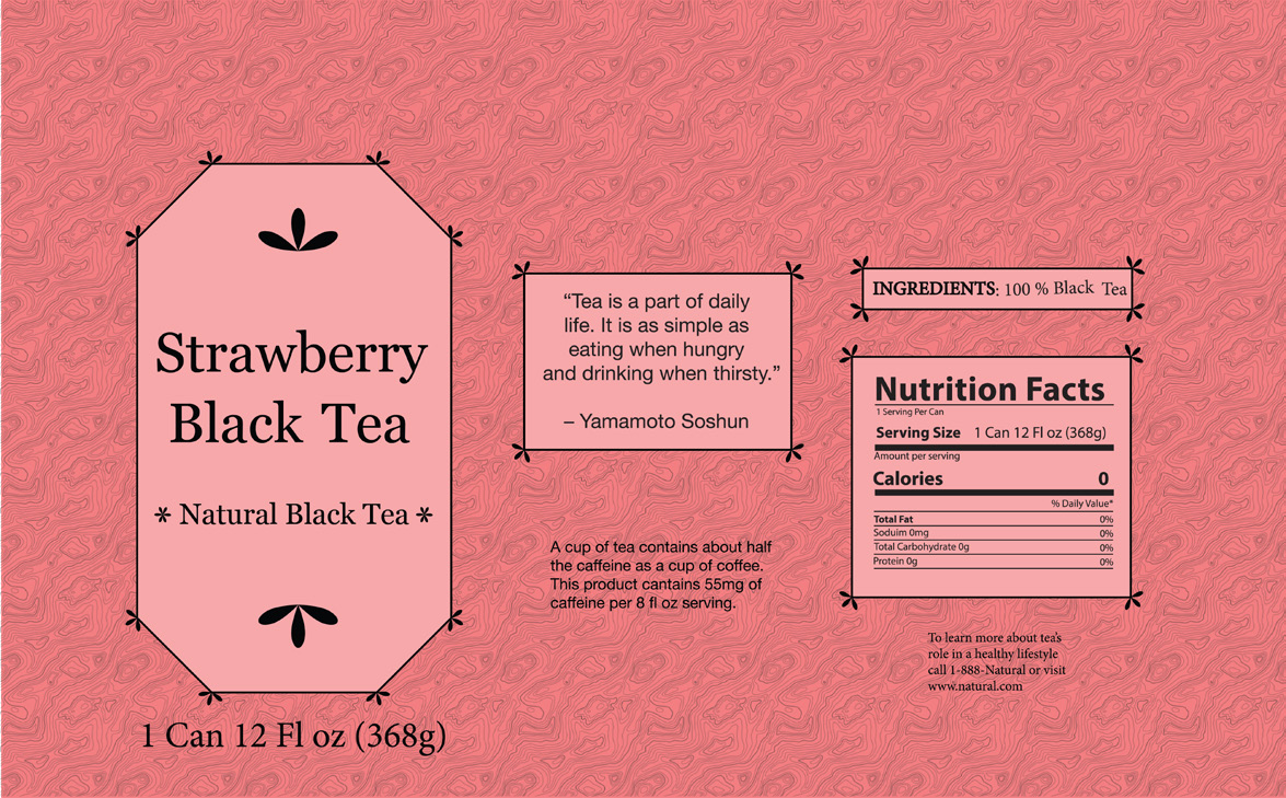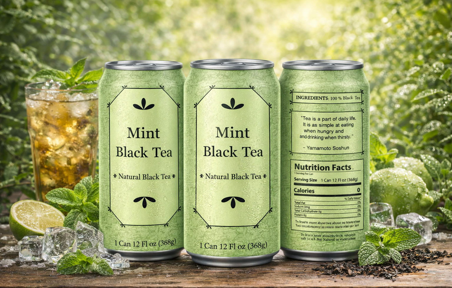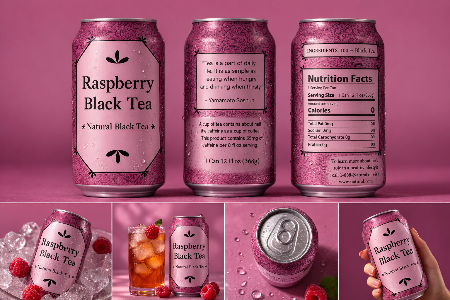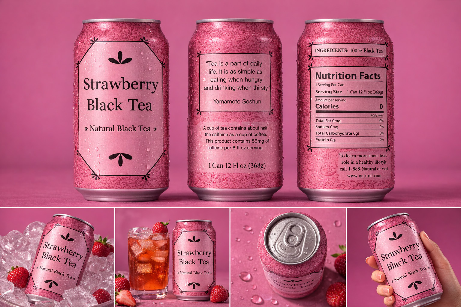 This project develops a tea beverage brand focused on natural ingredients and refreshing flavors. The product line includes Strawberry, Mint, Lemon, and Raspberry Black Tea, all using a consistent label design with distinct colors to differentiate each flavor.