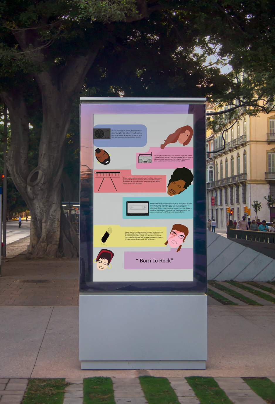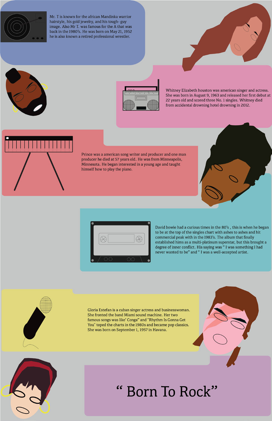 The “Born To Rock” poster is designed to celebrate influential music and entertainment icons from the 1980s who helped shape pop culture and the music industry. The design combines historical information and visual elements to highlight artists known for their talent, individuality, and cultural impact. Through bold typography, engaging imagery, and organized layout, the poster presents short biographies of key figures while capturing the energetic and expressive spirit of the 1980s music scene. The goal of the design is to create a visually appealing educational piece that informs viewers about legendary performers while reflecting the vibrant style associated with that era.